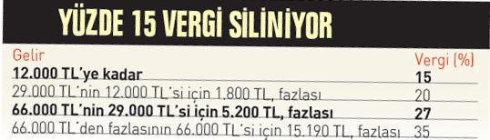 Vergi uzmanları, uygulamanın iki türlü olabileceğini belirtiyor. Buna göre, yıllık geliri 8 bin TL'ye kadar olanlardan yüzde 15'lik gelir vergisinin hiç alınmaması planlanıyor. Yıllık kazancı 8 bin TL'nin üzerinde olanlara ise istisna getirilebileceği belirtiliyor. Yani yıllık geliri 12 bin TL olanlardan 8 bin TL'ye kadar olan kazançlarından hiç vergi alınmaması, kalan bölümünün ise yüzde 15'lik vergi dilimine tabi tutulması gündemde.