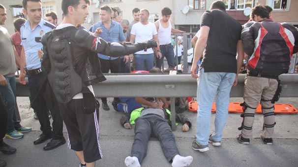 Bu sırada, aynı istikamette hızla ilerleyen 34 NE 1576 plakalı motosikletin sürücüsü Fırat Yıldırım (34), otomobilin sağ aynasına çarptı. Motosiklet kontrolden çıkarken, Yıldırım, yaklaşık 20 metre uçarak bariyerlerin dışına düştü. Bu sırada kaskı kafasından çıkan Yıldırım, beton zemine çakıldı. Yolda sürüklenen motosiklet ise yaklaşık 60 metre sonra durabildi.