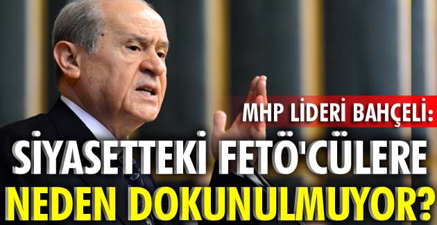 MHP Genel Başkanı Devlet Bahçeli partisinin grup toplantısında konuştu. Bahçeli, "FETÖ'nün siyasi ayağı gizemini korumaktadır. Öğretmene güç yetiyor da siyasetteki FETÖ'cülere neden dokunulmuyor? Neden bunların üzerine gidilmiyor? Odacı, çaycı, çorbacı biliniyor da hatırlı mevkilerde bulunan FETÖ'cülere neden sıra gelmiyor? Bu gecikmenin sebebi nedir? Bilmediğimiz bir müdahale mi vardır?" diye sordu.