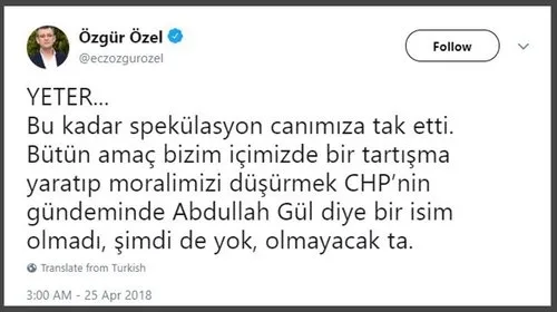 CHP Grup Başkanvekili Özel, sosyal medya hesabından Abdullah Gül ile ilgili açıklama yaptı. Özel, "Yeter. Bu kadar spekülasyon canımıza tak etti. Bütün amaç bizim içimizde bir tartışma yaratıp moralimizi düşürmek. CHP'nin gündeminde Abdullah Gül diye bir isim olmadı, şimdi de yok, olmayacak ta" ifadelerini kullandı.