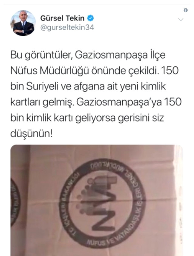 CHP İstanbul Milletvekili Gürsel Tekin kendi hesabından bir fotoğraf yayındı. Tekin'in paylaşımında "Bu görüntüler, Gaziosmanpaşa İlçe Nufus Müdürlüğü önünde çekildi. 150 bin Suriyeli ve Afgan'a ait yeni kimlik kartları gelmiş. Gaziosmanpaşa'ya 150 bin kimlik kartı geliyorsa gerisini siz düşünün" ifadeleri ile Gaziosmanpaşa İlçe Nüfus Müdürlüğü'nde çekildiği iddia edilen bir görsel yer aldı.