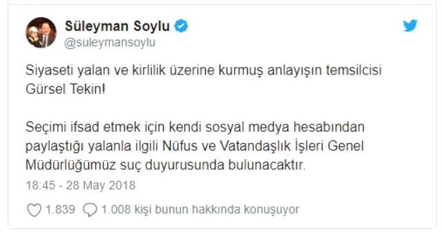 Gürsel Tekin'in paylaşımına Süleyman Soylu'nun tepkisi ise sert oldu. Soylu, "Siyaseti yalan ve kirlilik üzerine kurmuş anlayışın temsilcisi Gürsel Tekin! Seçimi ifsad etmek için kendi sosyal medya hesabından paylaştığı yalanla ilgili Nüfus ve Vatandaşlık İşleri Genel Müdürlüğümüz suç duyurusunda bulunacaktır." açıklaması yaparak sert bir şekilde yalanladı.