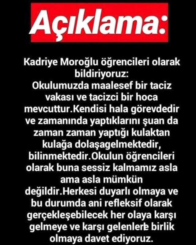 Milliyet'te yer alan habere göre; "Susma sustukça sıra sana gelecek" sloganları atan öğrenciler, "Okulumuzda maalesef bir taciz vakası ve tacizci bir hoca mevcuttur. Kendisi hala görevdedir ve zamanında yaptıklarını şu an da zaman zaman yaptığı kulaktan kulağa dolaşmaktadır. Buna sessiz kalmamız asla ama asla mümkün değildir" denildi.