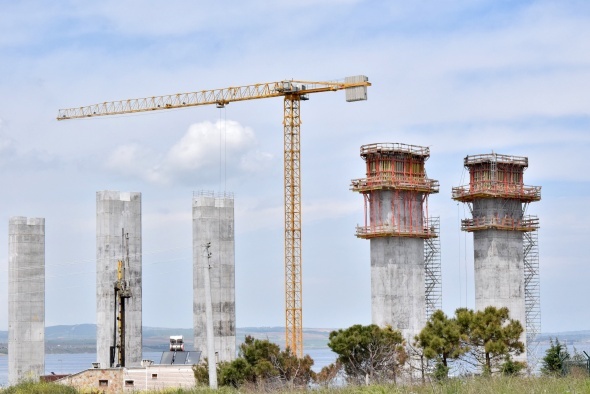 2/7Cumhurbaşkanı Recep Tayyip Erdoğan tarafından 18 Mart 2017`de temeli atılan ve Çanakkale`nin Lapseki ilçesine bağlı Şekerkaya ile Gelibolu`nun Sütlüce mevkii arasında yapımı süren 1915 Çanakkale Köprüsü`nün ayakları her geçen gün yükselmeye devam ediyor