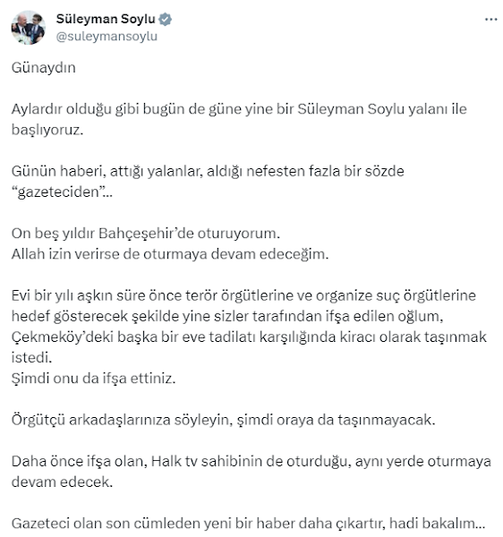 Hakkındaki iddialara ateş püsküren Soylu'nun paylaşımlarında şu ifadeler yer aldı: "Günaydın. Aylardır olduğu gibi bugün de güne yine bir Süleyman Soylu yalanı ile başlıyoruz. Günün haberi, attığı yalanlar, aldığı nefesten fazla bir sözde "gazeteciden"… On beş yıldır Bahçeşehir'de oturuyorum. Allah izin verirse de oturmaya devam edeceğim.